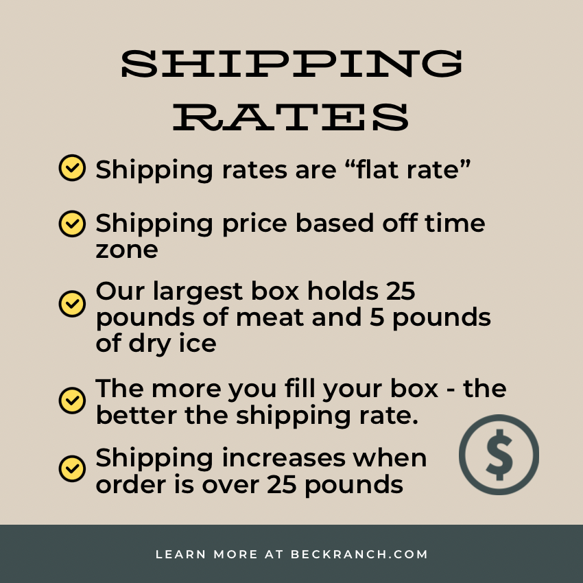 We suggest you buy at least 5 pounds of meat. The more meat, the better the cold is held in. We ship in insulated liners with dry ice. Your meat should arrive in 2 days of leaving the ranch. We always pack with extra ice just in case there is a delay. Contact from the dry ice may make micro-holes in the packaging. This is normal and the meat is still good to put in your freezer to eat.